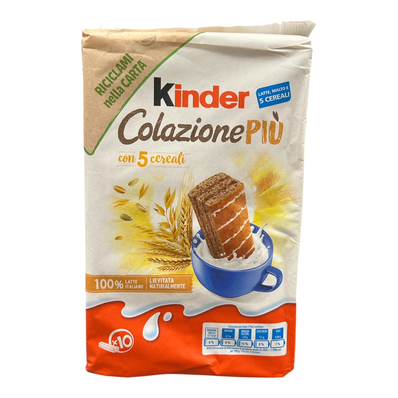 Ingredienti: Farina di frumento (23,5%), Zucchero, Olio di palma non idrogenato, Tuorlo d’uovo (8%), Latte in polvere reidratato (6,5%), Acqua, Fiocchi macinati (3,8%) di: riso, orzo, segale, avena, frumento, Latte scremato in polvere (3,5%), Glutine di frumento, Lievito di birra, Estratto di malto d’orzo (1,4%), Proteine del latte, Emulsionanti (mono e digliceridi degli acidi grassi), Aromi, Farina di riso, Cacao, Cacao magro, Amido di frumento, Estratto di caffé solubile, Sciroppo di glucosio-fruttosio, Sale, Albume d’uovo in polvere, Può contenere soia, mandorle, nocciole, senape Allergeni: Potrebbe contenere Mandorle, Contiene Orzo, Contiene Uova, Contiene Pesce, Potrebbe contenere Nocciole, Contiene Latte, Potrebbe contenere Senape, Contiene Avena, Contiene Segale, Potrebbe contenere Soia, Contiene Grano/Frumento Non contiene Coloranti; Non contiene Ingredienti geneticamente modificati; Non contiene Conservanti